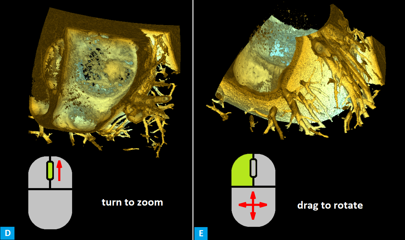 Figure 12. 3D volume settings. Zooming in (A), obtaining the view from the left ventricle by rotating the volume (A → B).
