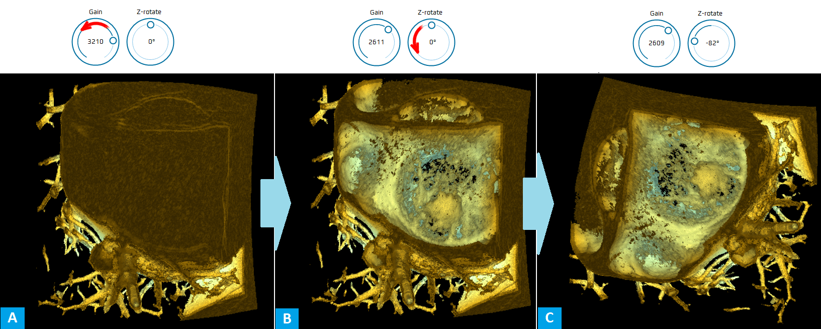 Figure 11. 3D volume settings. Gain adjustment (A → B), Z-rotation to obtain a surgical MV view with aorta on top (B → C).