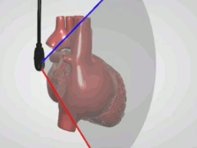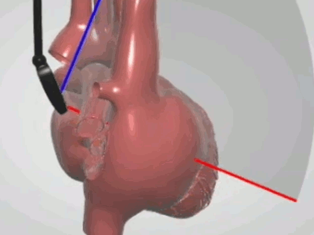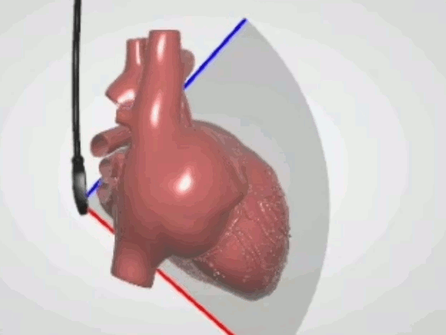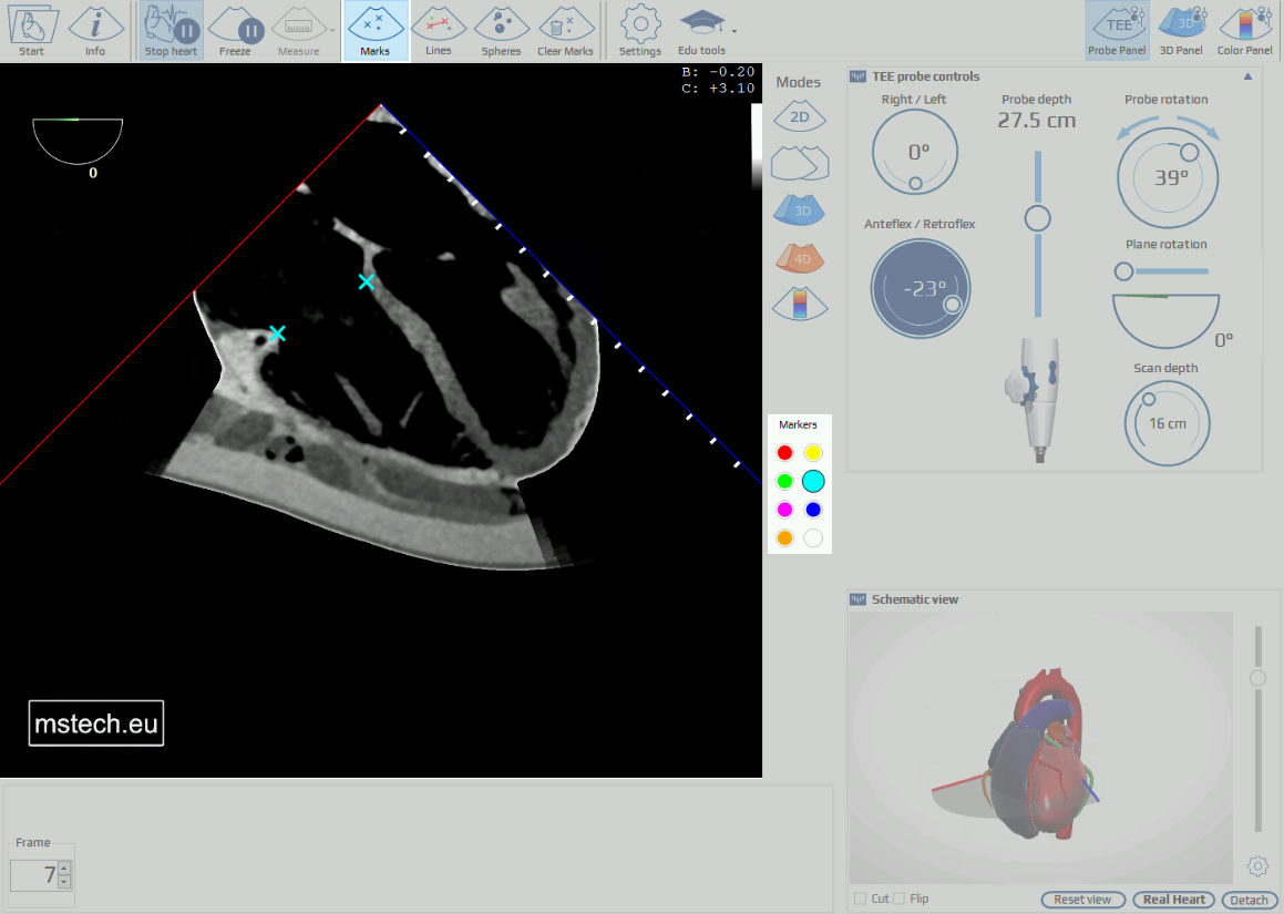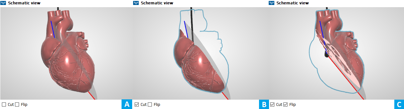 Below the TEE panel, the animated model of the heart with superimposed TEE imaging plane is displayed. The model can be rotated with the mouse and enlarged using the mouse wheel. The panel can be detached from the original position, moved with the mouse to the desired location on the screen and resized by dragging the edge/corner of the window. By clicking CUT the section of the model corresponding to the TEE plane orientation can be displayed. Clicking FLIP causes display of the opposite part of the section.