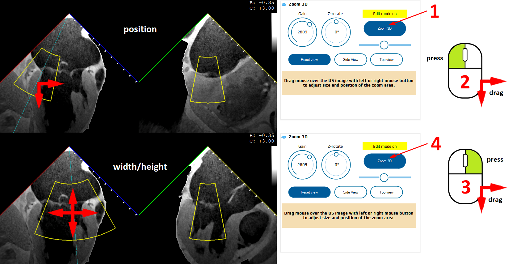 Clicking the Zoom 3D button (Fig. 9. Nr 1) activates two boxes that let the user select the region of interest (ROI) on both xPlane views, using a mouse (Fig. 9. Nr 2 and 3).