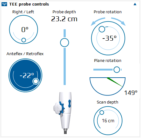 The TEE control panel shows the position and orientation of the TEE probe and imaging plane. Using a mouse the User can change each of the manipulators settings. It can be manipulated by dragging or using the mouse scroll wheel when the coursor is on the given control. Hover over any of the manipulators to see its function.