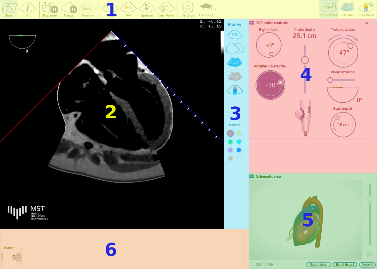 The user interface window layout has 6 main sections: Top main menu (1), TEE sector view (2), modes panel (3), TEE probe control panel (4), heart visualization sector (5) and the bottom bar (6).